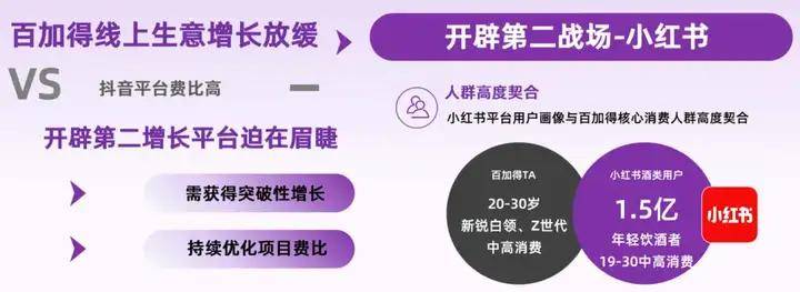 百加得的挑战面临不同挑战:抖音平台费比攀升,传统货架思维无法在小红书连接年轻人群,急需开辟新生意赛道。