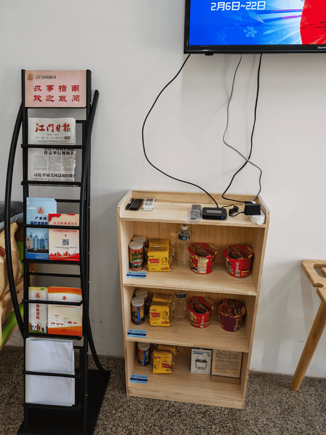 “爱心驿站”选址于江门市民政局一楼老年助餐服务点,位于老城区,周边居住人群较多,驿站内设有空调、暖风机、热水机、电视、电脑、WIFI、桌椅、手机充电线等,摆放有方便面、饼干、八宝粥、矿泉水等食品以及衣物、棉被等物资,可全天24小时为流浪乞讨、务工不着、手机没电等临时遇困人员提供自助式暖心、便捷服务,遇困人员通过刷身份证、人脸后可进入驿站内按需自助享受服务。驿站内24小时智能监控系统保障夜间安全,遇困人员无身份证的,可随时联系江门市民政局一楼门卫协助开门进入驿站,领取食物或物资后如实签领即可。